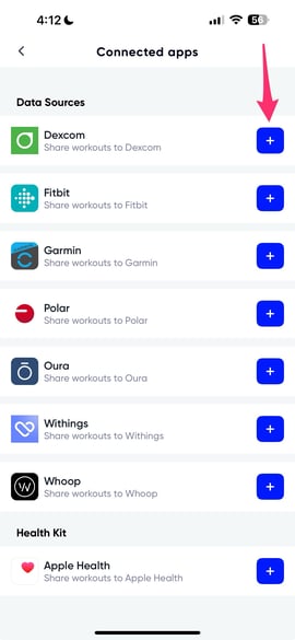 4. Tap the "+" next to the apps you want to connect to. You will be taken to the app to log in and establish a connection.
